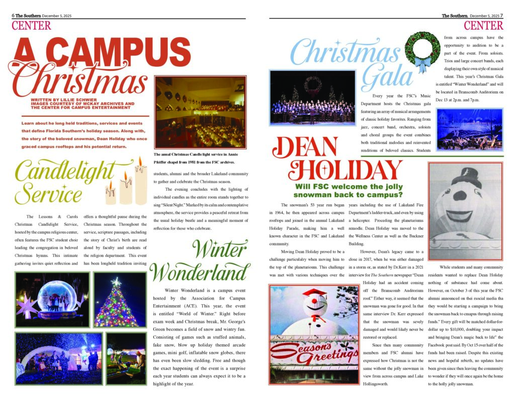 Learn about he long held traditions, services and events that define Florida Southern’s holiday season. Along with, the story of the beloved snowman, Dean Holiday who once graced campus rooftops and his potential return.
