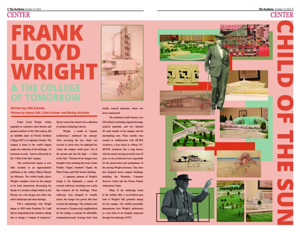 FSC’s relationship with Wright began in 1938 when President Dr. Ludd Spivey telegrammed the architect, asking him to design a “campus of tomorrow.” Spivey wanted the school to be a reflection of modern technology and art.