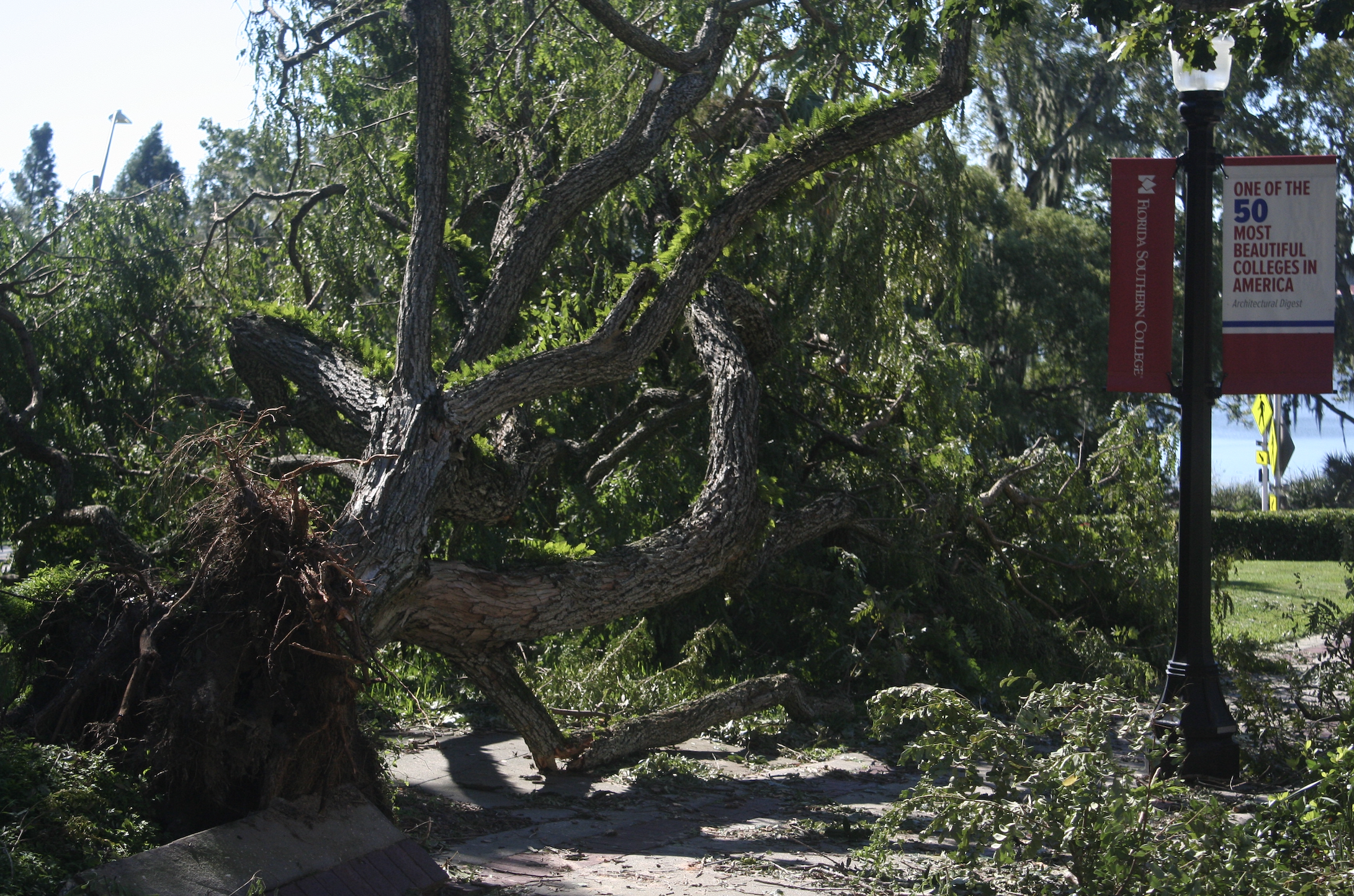 At Florida Southern College, trees were uprooted—some blocked sidewalks. Branches fell from trees causing various damages to campus, and a glass door was shattered in Honeyman Pavilion. All were caused by the winds of Hurricane Ian that battered Southwest and Central Florida.