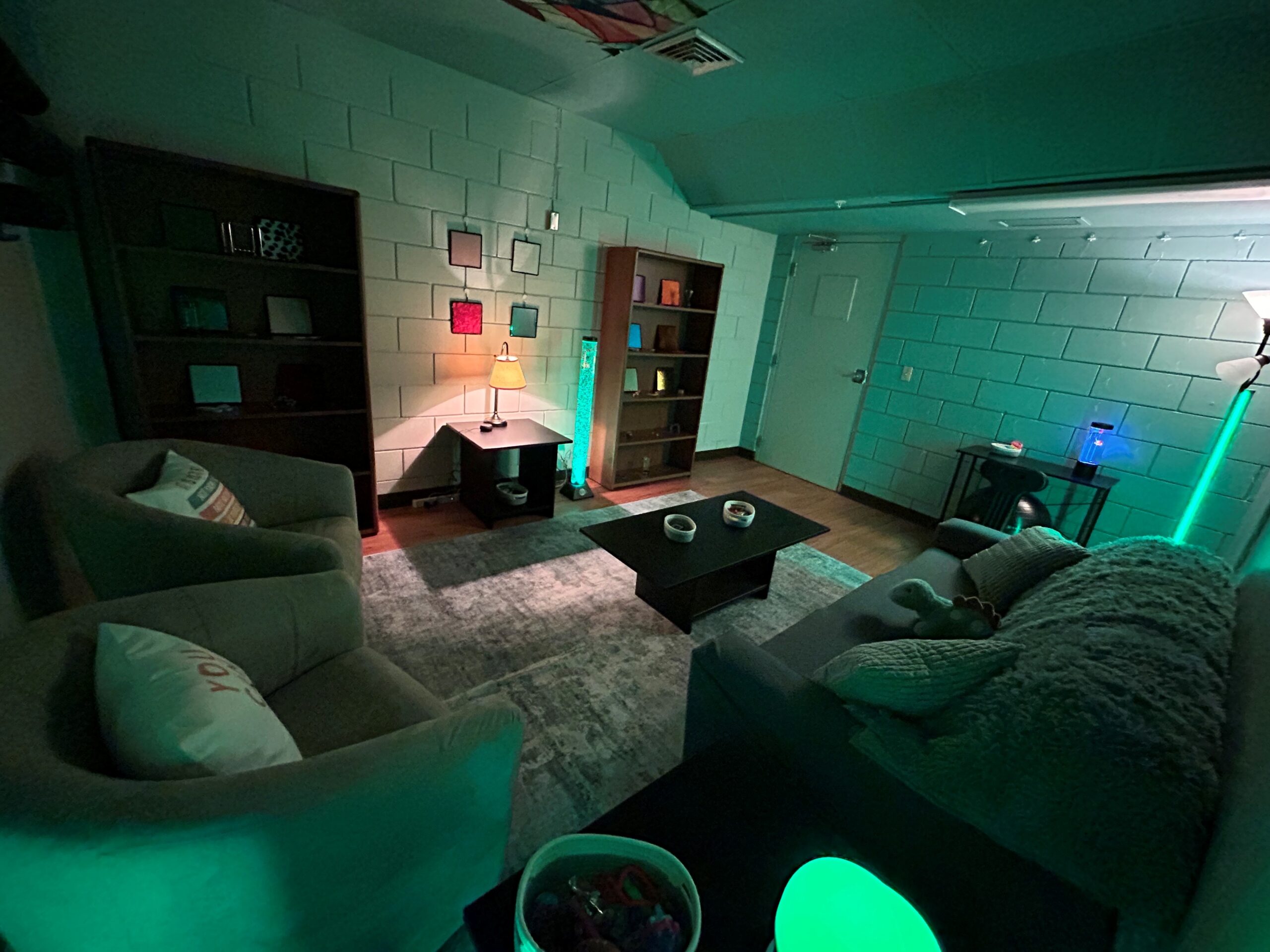 In the sensory rooms they have comfortable seating such as couches, and chairs or even a bean bag chair. There are also lights and stress toys to help with students. When you go into the rooms the goal is to help you relax for a little while.